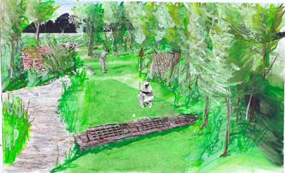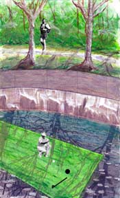 The entrance off of Haverford St. crosses over the swale, through a filter of birch trees and over a hill before reaching the golf course. (Plan) The view is increased by looking out over the park making the space seem larger than it actually is - creating more space. A large wall slices into the hillside revealing its topography. |