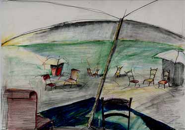 The middle of the site, the apex of its descent is a watering hole, where the game of golf is forgotten and the murmers of water is replaced by the murmer of voices, the gentle creaking of chairs.The collection and recollection of water on the site becomes the collection and recollection s of players of the game. If you were to put a golf course here, I would want to watch, but that's all a resident, sitting on a chair, outside of the door, facing south, on Friday September 29.1997 |