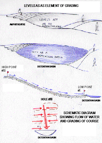 The course is graded such that hole #1 is at the highest point and hole 1 is situated near the detention basin which is created at the start.All the holes slope towards a central spine which leads from hole #18(which is on a mound) to the detention basin.