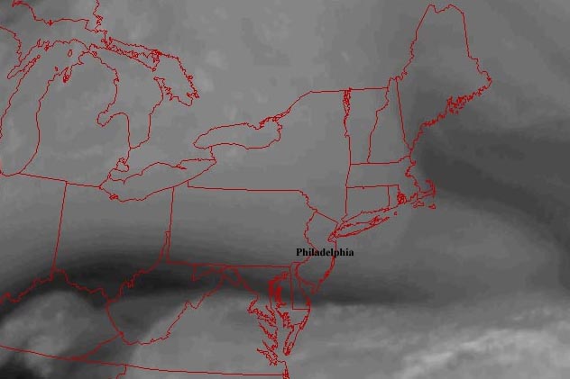 air The wind in Philadelphia blows at an average speed of 10 miles per hour. Peak gusts reach 60 mph.During the summer the prevailing wind is from the south west and in the winter it is form the north west. Eastern winds acrosss the Atlantic ocean increase the level of humidity within the city. The position of Philadelphia between the Appalachian mountains to the west and the Atlantic ocean in the east result in a moderate climate. Rare are the days below O degrees Fahrenheit and above 100. There is however a temperature fluctuation of about 48 degrees with the hottest temperatures in the eighties occurring in July. January, the coldest month is marked by temperatures in the 30's.