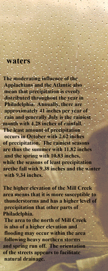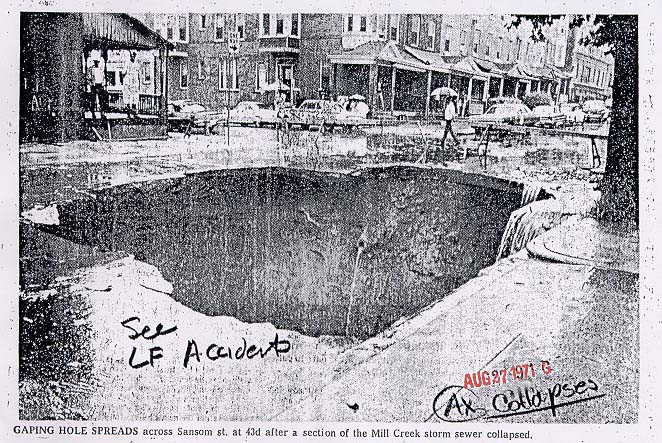 | In 1971, the amount of rain to fall on a single day was striking, 4.28 inches on August 27. This record level of rainfall coincided with the collapse of the Mill Creek sewer at the corner of Sansom and 43rd Street. However , a high level of precipitation does not always correspond to sewer collapse. Sometimes a collapse is preceded by steady rainfall over a period of time and sometimes it is unprecedented. |