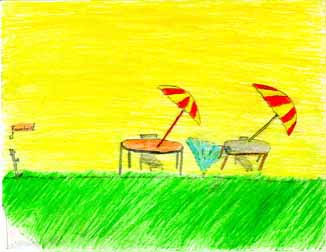 It will have brightly colored umbrellas. It will have white tables. The fountain is grey around it. The grass gets watered every two days. The chairs have bright colors on them. The food stand will have a good deal of things. It will have candy and chips, and food that the people who work there cook. Many people from the community will be there. This will be open for the community.