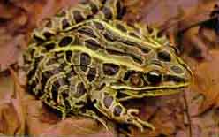 leopard frog size: 2-5" long coloring: slender brown or green frog with light edged dark spts , light stripe on jaw characteristics: low guttural snore, lasting 3 seconds, clucking notes habitat: profuse vegetation, marsh grasses, make burrows in muddy banks life cycle: eggs are attached to submerged vegetation food source: insects