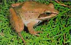 wood frog size: 1-3'8 long coloring: tan or dark brown with mask around eyes and behind ear drum. dark blotch on chest near base of front leg characteristics: short raspy quacks habitat: moist woodlands life cycle: eggs are attached to submerged vegetation, hibernates in forest debris, has antifreeze compound in blood and can survive freezing food source: insects |