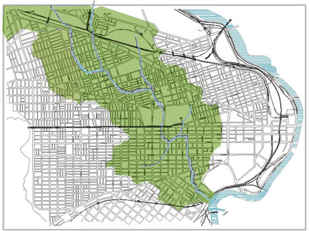 In West Philadelphia, hills and ridges also create a watershed. Rain that falls in the green area on this map flows into Mill Creek