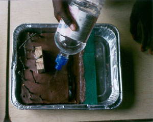 2. Students slowly pour a glass of water over the model to simulate rainfall.