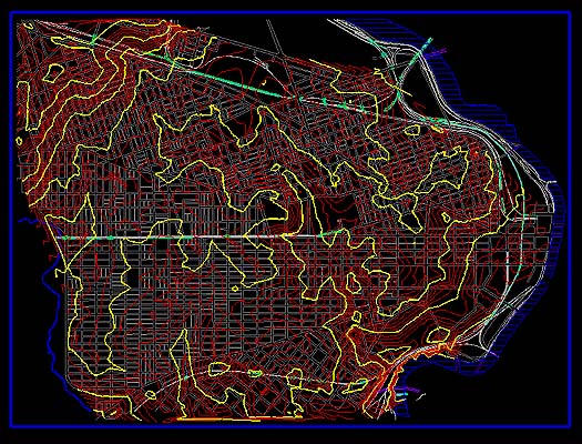 The topography maps show contour lines at one, two, five, and ten-foot intervals. These lines are based on approximately four thousand street corner spot elevations digitized from Philadelphia City Streets Department and Water Department maps. They were interpolated using a road alignment and terrain modeling software called InRoads. Shown here is the 5ft contour interval map.