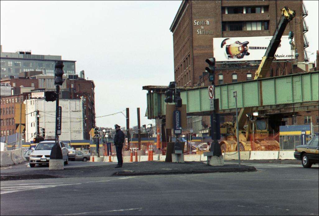The elevated highway ends abruptly at Haymarket Square. Looking to the north, down North Washington Street.