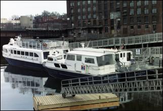 The MBTA runs shuttles across Boston Harbor. Here, two boats wait at Lovejoy Wharf near North Station.