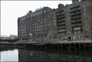 Description : In between the Charlestown Bridge and Lovejoy Wharf, a waterfront building is built on top of decaying piers.