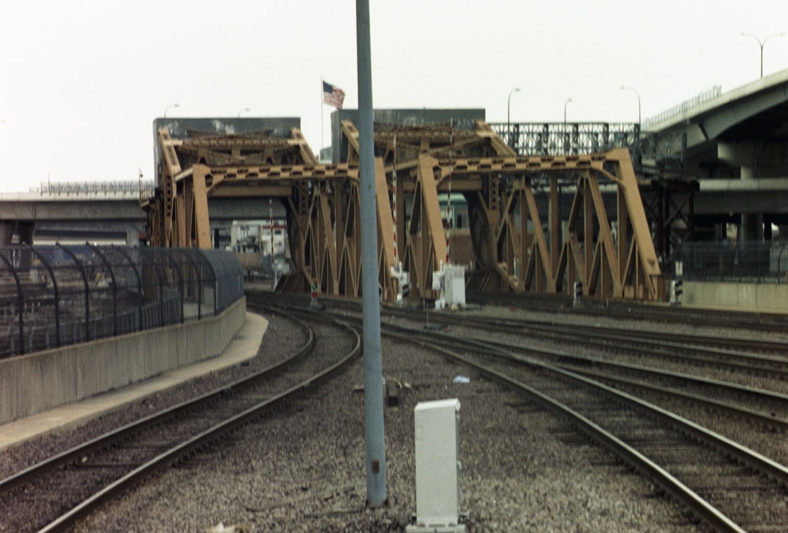 There are four tracks of drawbridge immediately north of North Station. The signal on the leftmost track indicates the the train is clear to cross the bridge.