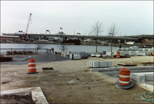 Part of the Big Dig project is building new parkland along the Charles River. Here work is going on near North Station. 93 and the Zakim Bridge are to the right; the Museum of Science is to the left.