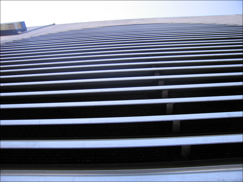 A ventilation grate on the side of the "second" entrance to the Alewife T station, as seen from the ground, looking up.