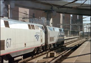 Amtrak GE Genesis engines 192 and 67 prepare to lead their train south from Boston.