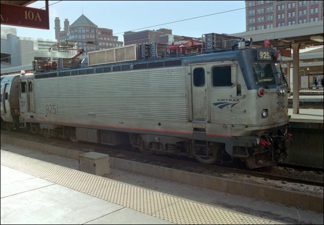 Amtrak AEM-7AC 925 waits at South Station after completing its run.