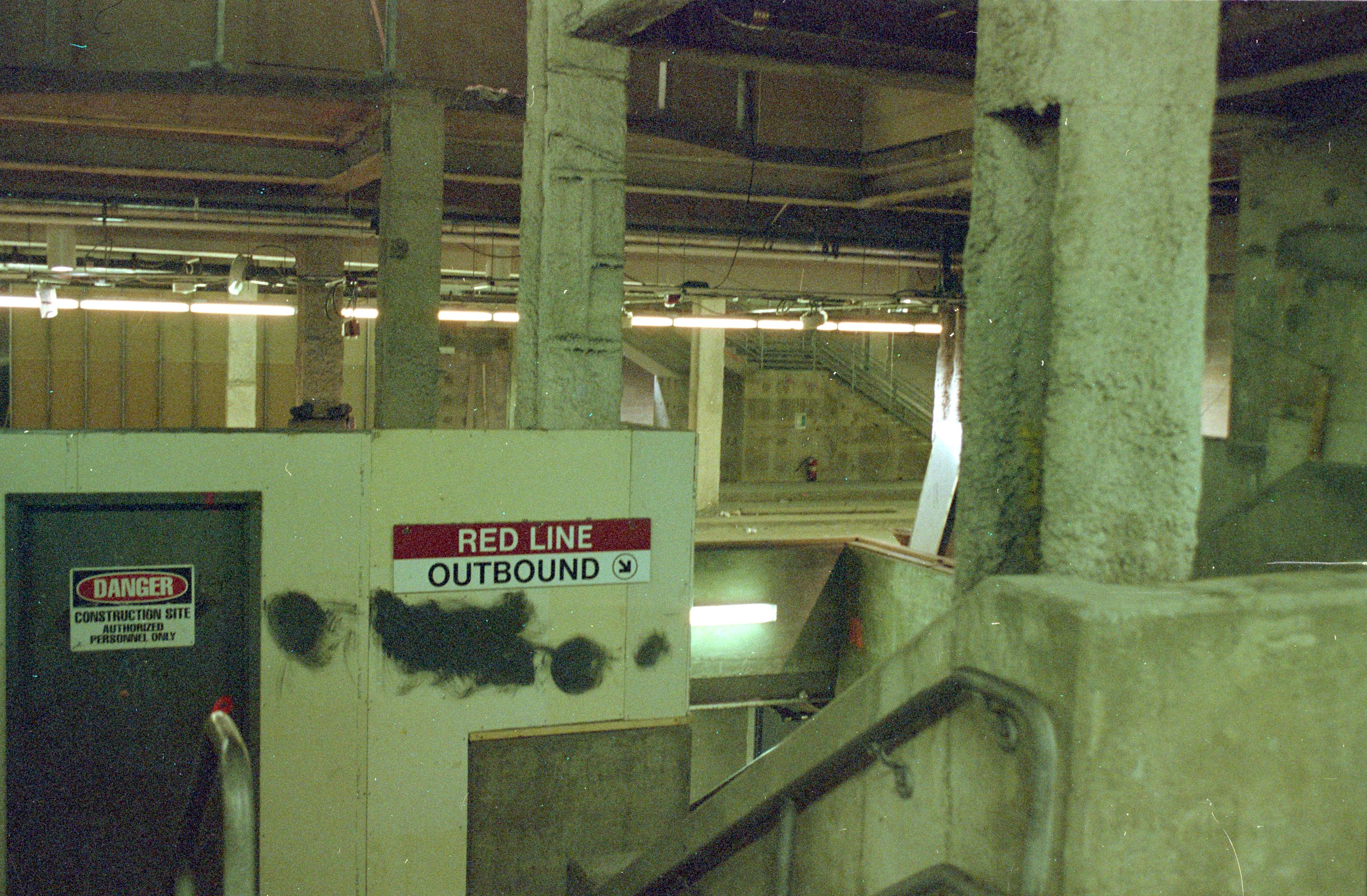 Signs point down to the Red Line platform, while construction on the Silver Line goes on above.