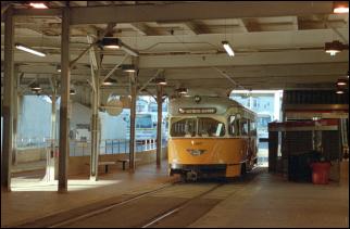 Ashmont-Mattapan "Wartime" PCC 3087 arrives at the streetcar loop at Ashmont Station.