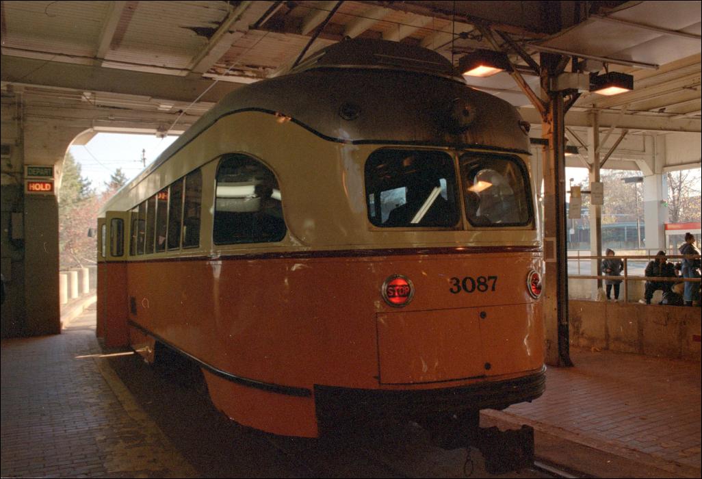 PCC #3087 loads passengers on the left side; outbound travel on the Mattapan line is free.