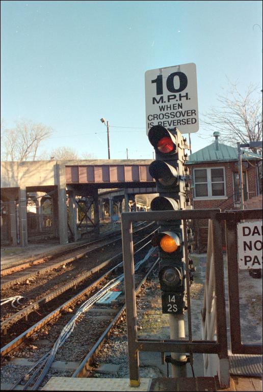 "10 M.P.H. when crossover is reversed": the red-over-yellow signal on MBTA rapid transit lines indicates that the train will cross over to the opposite track.