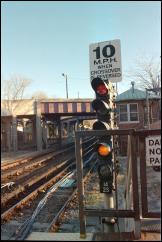 "10 M.P.H. when crossover is reversed": the red-over-yellow signal on MBTA rapid transit lines indicates that the train will cross over to the opposite track.