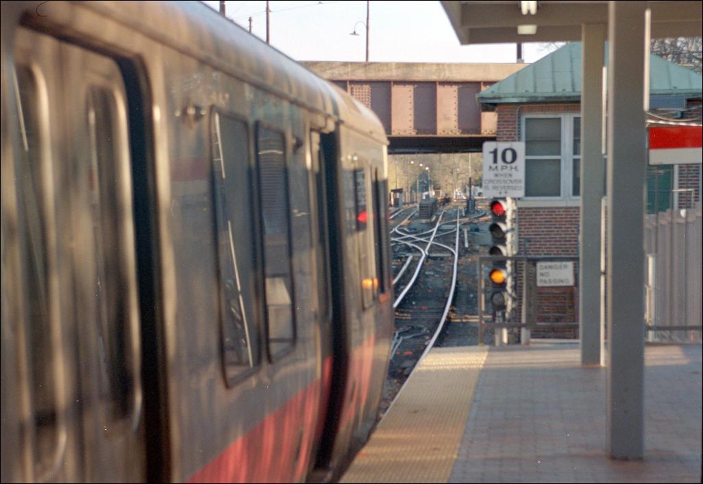 Description : Having made its last stop at Ashmont, an outbound Red Line train prepares to turn around using the crossover track. "Last stop. Thank you for riding the T. Don't forget your belongings."