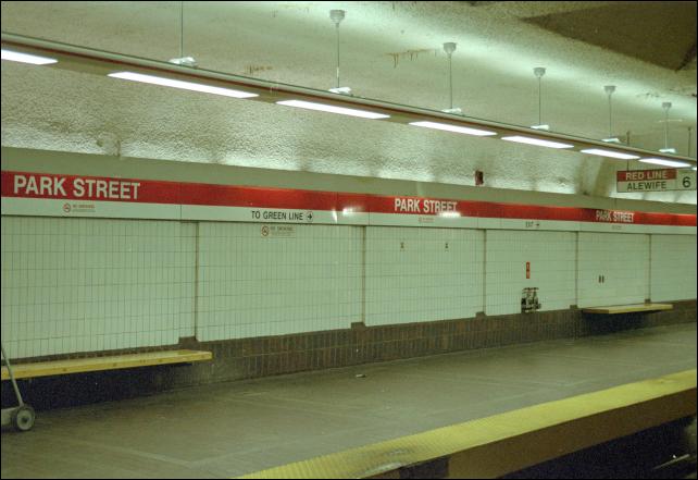 The far end of the northbound Red Line platform at Park Street is deserted.