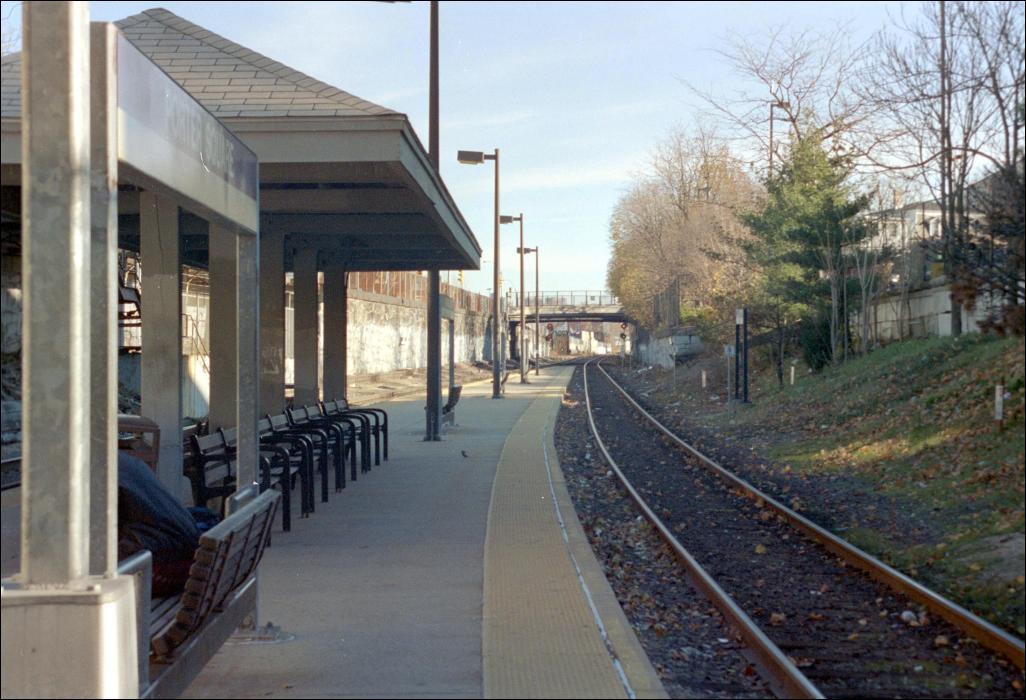 The commuter rail platform at Porter Square is nearly empty of people waiting for an inbound train to North Station.