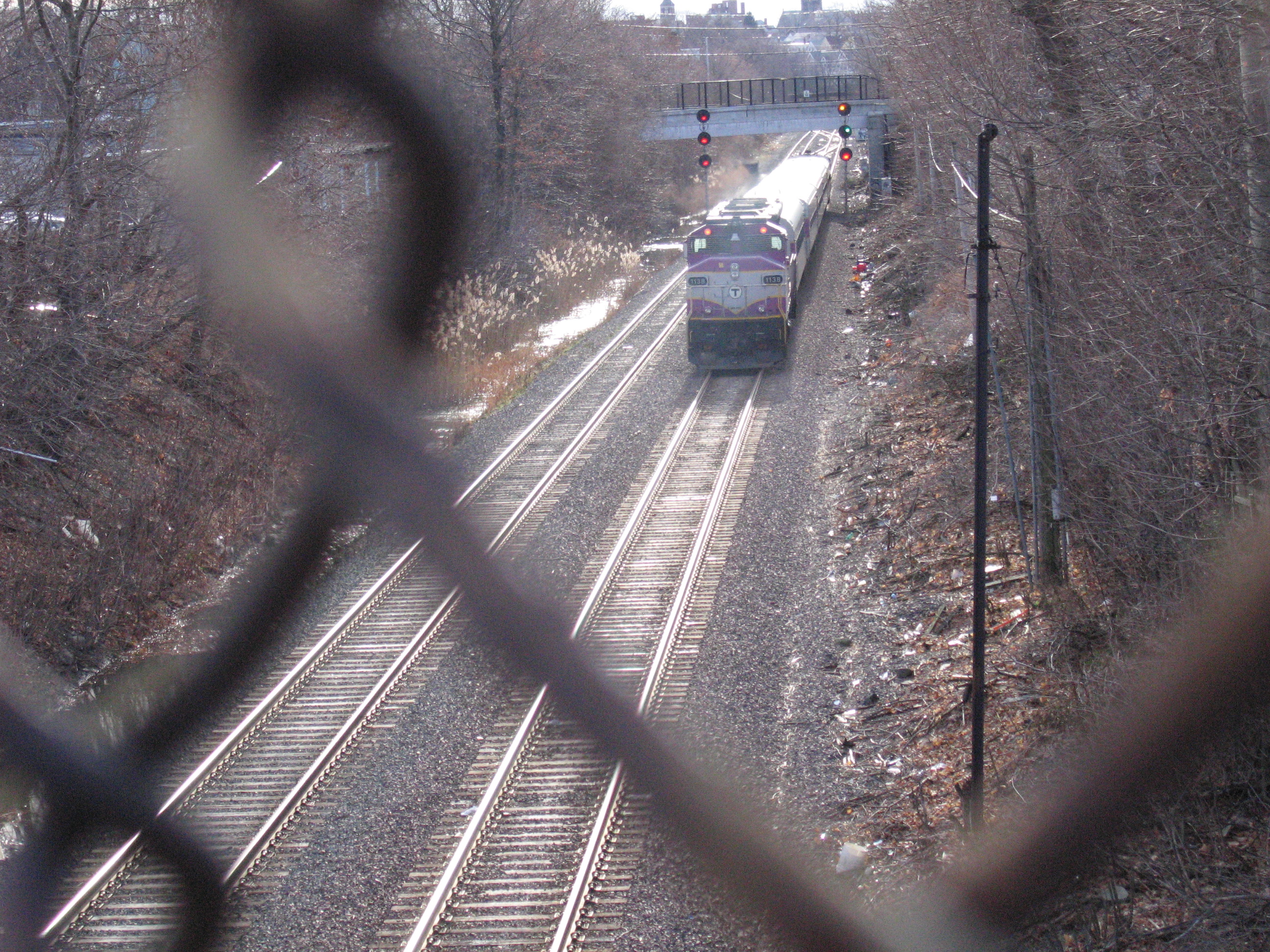 An inbound MBTA commuter rail train passes an "approach medium" signal as it approaches the Cedar Street bridge.
