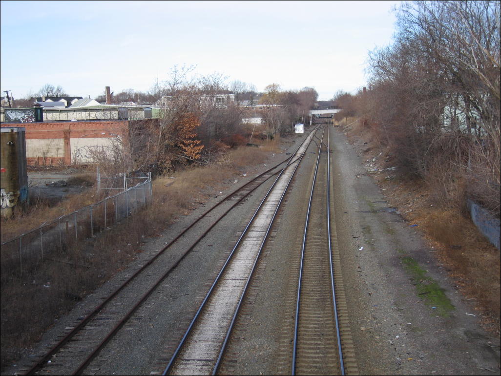 The commuter rail narrows from three tracks to two headed north out of Somerville. The leftmost track is a largely unused freight track; the two tracks on the right carry MBTA commuter rail and the Amtrak Downeaster.