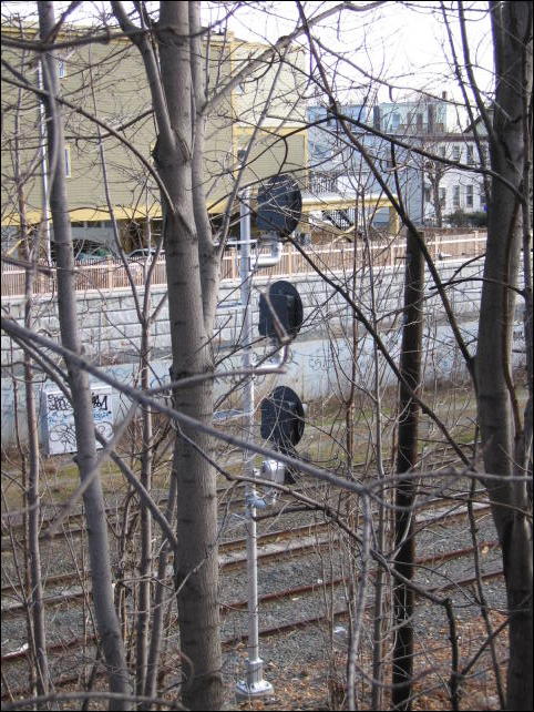 Another signal. Note the small signal head below and to the left of the bottom head of the main signal; I can't tell what it's for, and there's a separate dwarf signal protecting the freight track here.