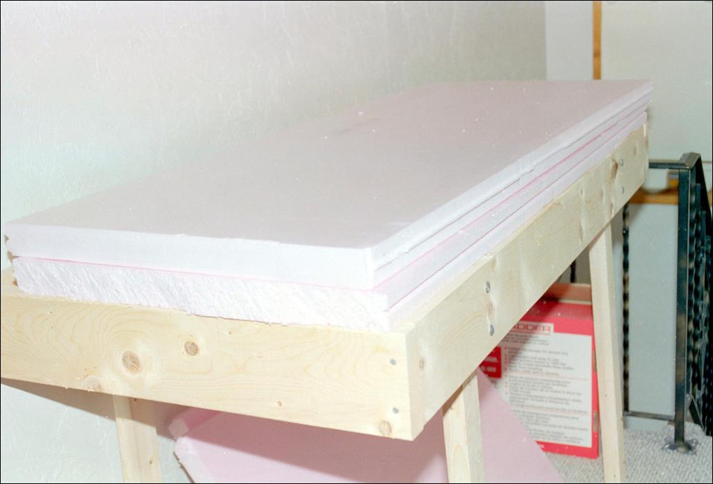 Description : As the first step to building the foam block, the 8' length is cut down to the correct 60" length. The remainder sits under the table.