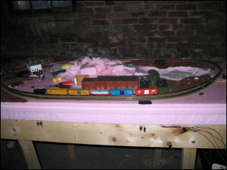 What the table looks like right now. Some scenery work has been done; this includes carving out large chunks of Styrofoam.