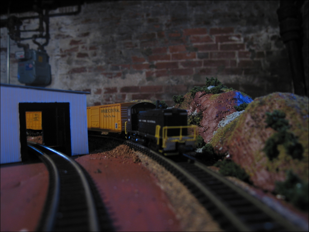 The train climbs the short grade between the hills and the warehouse.