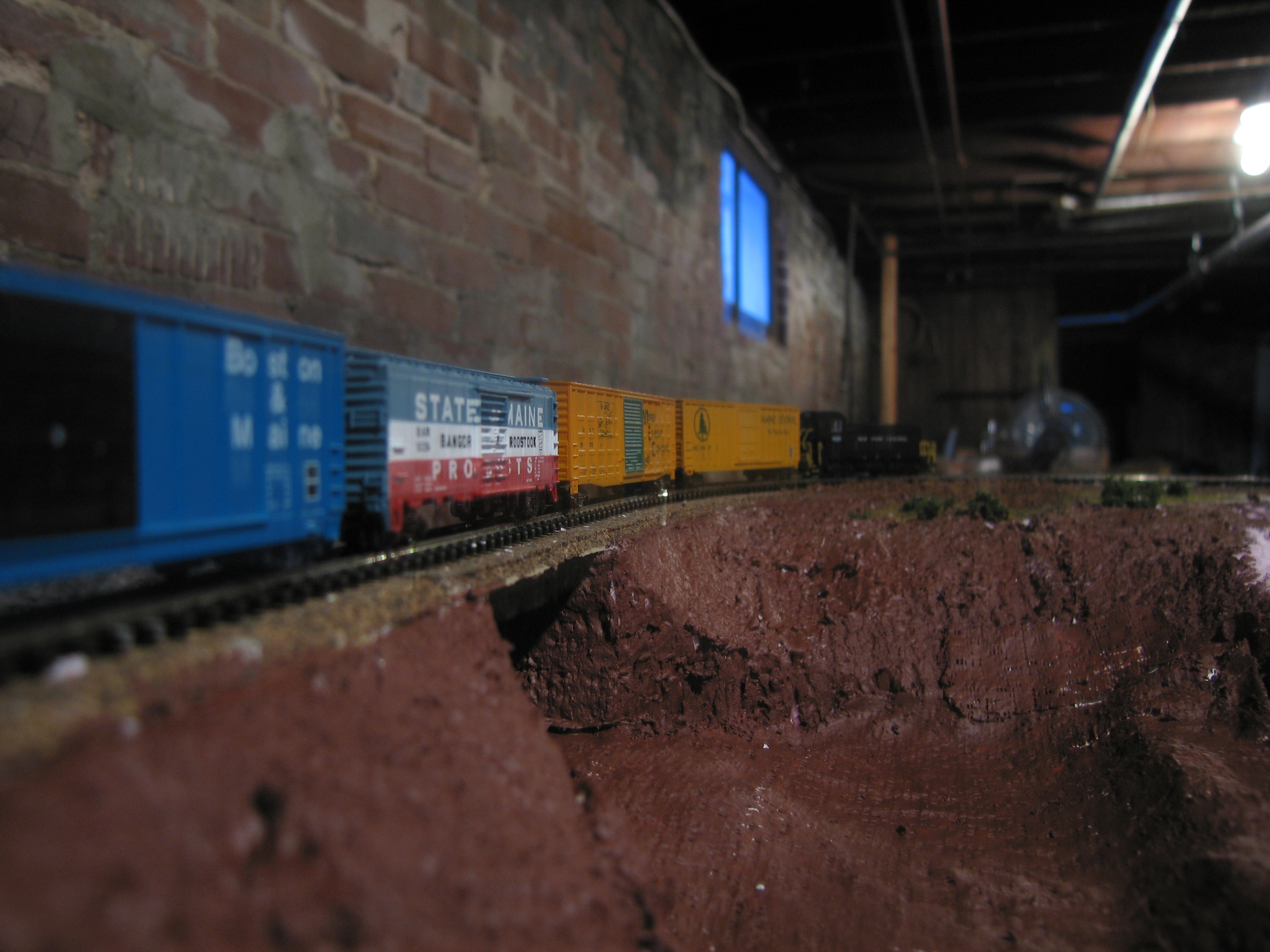 Here the train runs along a berm above the lake-to-be.