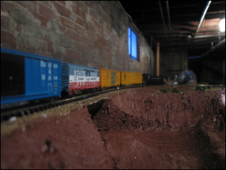 Here the train runs along a berm above the lake-to-be.