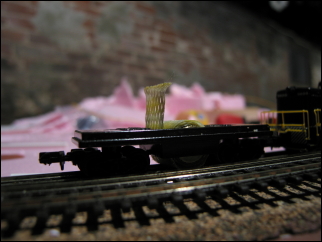 Description : This little gizmo is a track-cleaning car. The yellow cloth is wrapped around a brass roller. It's mostly a device for applying Goo-Gone or something similar to track and wiping it off.