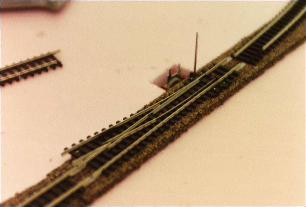 The switch machine mounts on the bottom of the turnout. With a Styrofoam base, the switch machine fits into a space cut out for it.