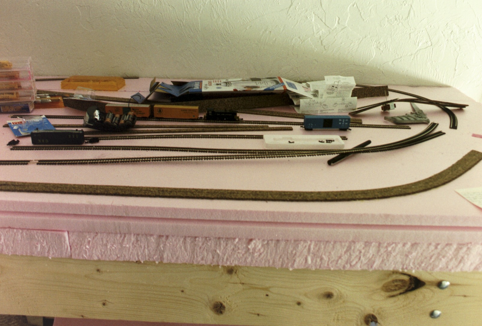 The table is a convenient storage space for train-related things. This makes it a bit messy. I've started to glue down the roadbed at this point, though. The hole for the switch machine is visible at the far right.