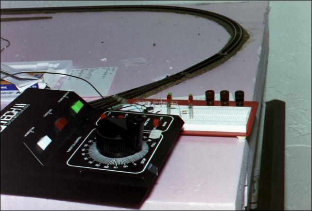 A 20-year-old power supply actually runs the layout quite happily. The breadboard behind it has mostly been used for experimentation; right now it can run the layout (briefly) as well.
