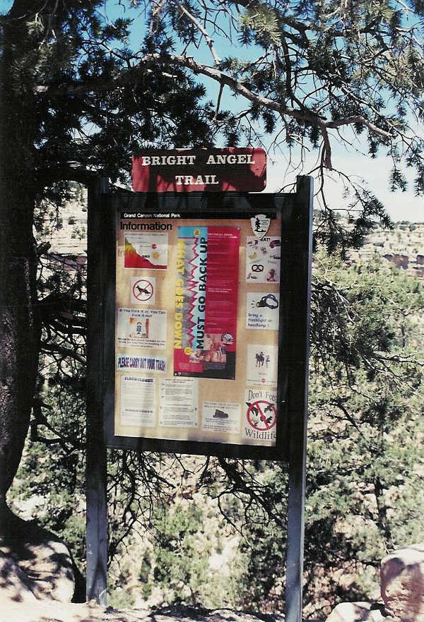 Description : Sign at the top of the Bright Angel Trail, leading down into the Grand Canyon. Posters include warnings about packing out your trash, as well as dire warnings about heat: you cannot hike to the bottom of the canyon and back in a single day. A later sign gives recommended endpoints for day hikes, depending on how early you're leaving and how much water you have.