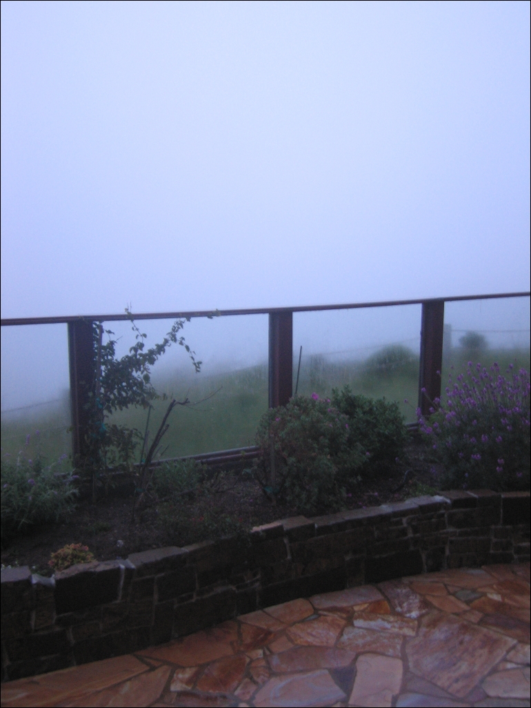 Fog out the back door of the house. When it's clear, you can see the ocean.