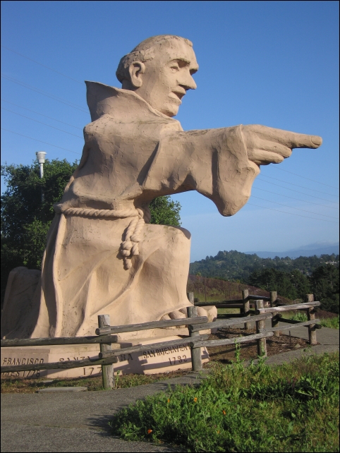 A statue of Father Junipero Serra, founder of the California missions, points out across 280.