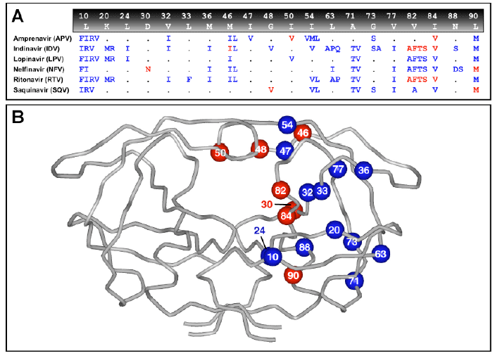 [PI Resistance sites, from M.E. Quiñones-Mateu1 and E.J. Arts, HIV Reviews 134 (2001)] [Rhee et al, NAR31, 298 (2003), Fig1]