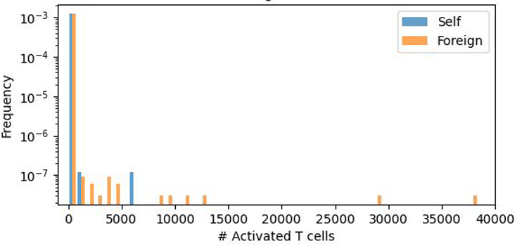 The probability is dominated by encounters with rare (hydrophobic) peptides that activate many T cells