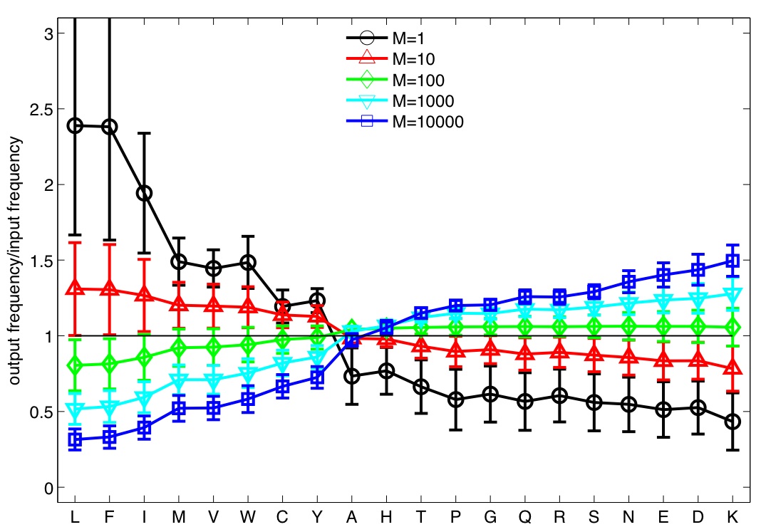Simulations were performed for TCRs of length N=5 and varying values of M