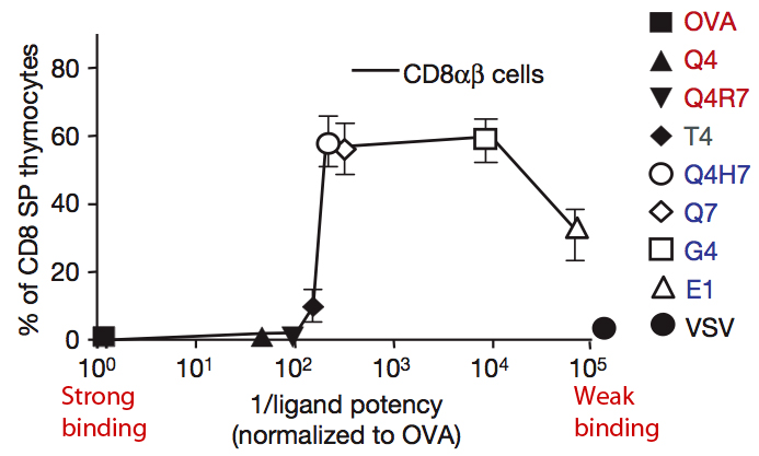Positive selection: TCR must bind sufficiently strongly to at least one self pMHC