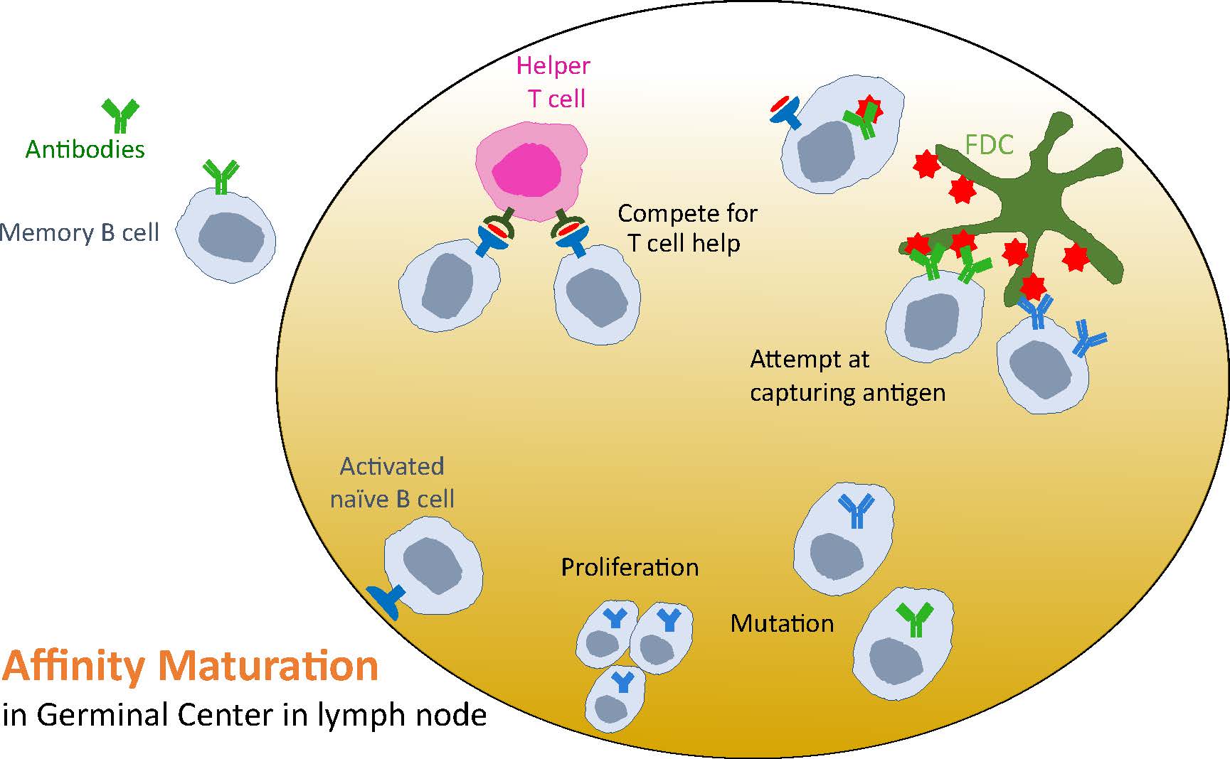 Antibody maturation occurs takes place in Germinal Centers formed in lymph nodes: