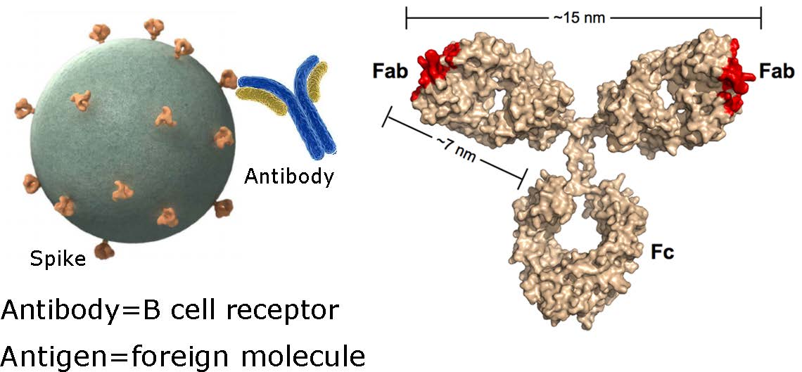 The mutating B cell Receptor (BCR) binds to spikes of presented virus: