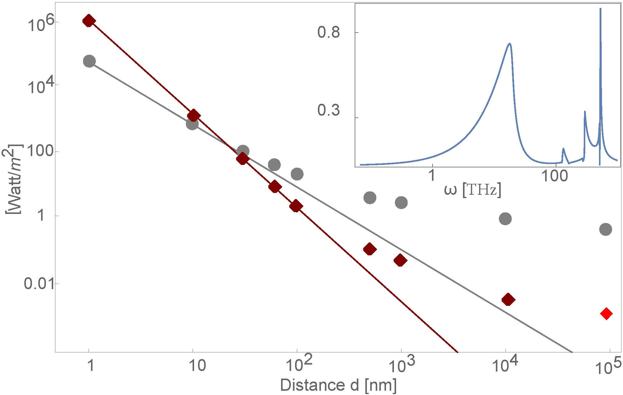 Scaled motive force F (red diamonds), and heat transfer H (gray circles) for a SiC plate and one of n-InSb subject to a magnetic field along the x-axis. The dots correspond to numeric calculations and the continuous lines to the small d asymptotes. Note that the force changes sign from +y to -y (dark red to light red diamond) at large separation. Inset: [f(ω)/h(ω)](ωd) for d= 1nm.