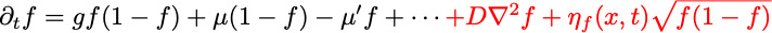 Diffusion and and stochasticity in reproduction (so-called demographic noise) broadens the above to